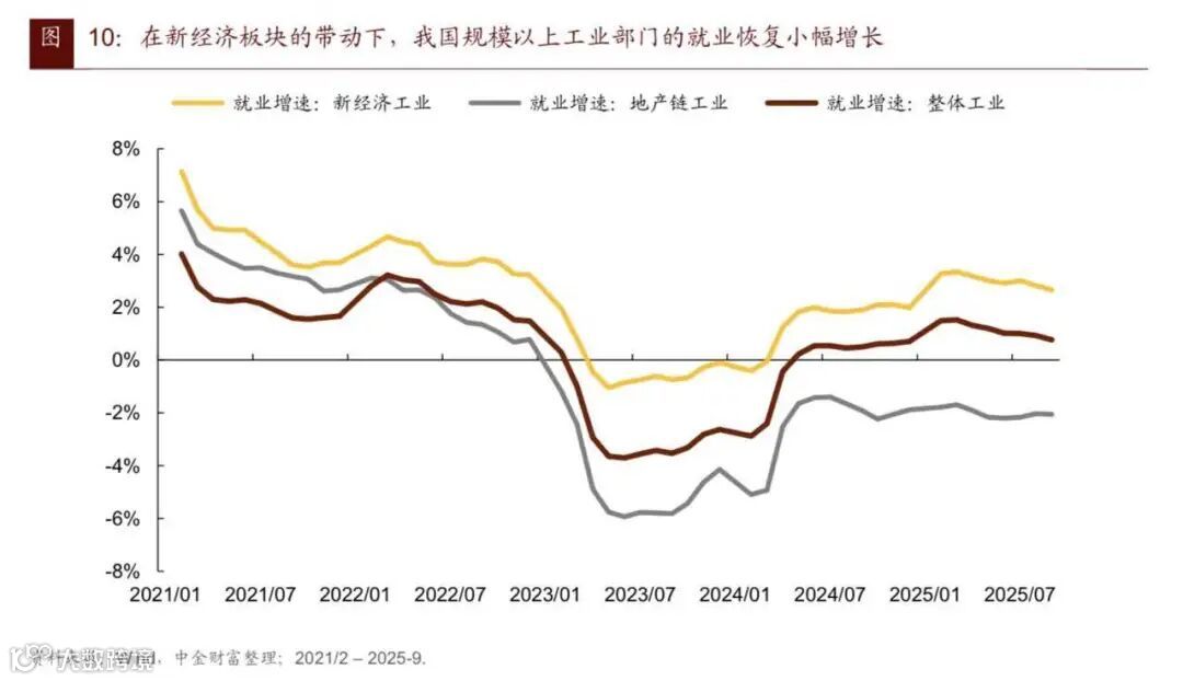 尽管我国的就业类统计数据尚不成熟,但是通过对规模以上工业企业的就业观察,我们发现2025年地产相关产业的低迷仍然在拖累就业,但是新经济部门也在催生出大量的新增就业岗位,并开始超过前者带来的岗位损失(图9-4)。这与2010年初的美国就业市场存在非常相似的特征。