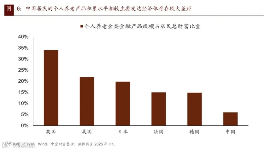 在我国,个人积累型养老资产比例不足的问题较为突出。我们预期中国居民持有的养老金类金融产品规模仅占居民总财富的6%,GDP的20%。这与OECD国家居民财富的20%、GDP的100%存在明显的差距(图6)。也正是在个人补充养老金的需求下,我们看到长期寿险产品在2025年的规模增长依旧迅速。以保单和个人养老金账户等“第三支柱”形式补充个人长期储蓄、应对长寿时代可能是穿越经济周期的长期趋势。
