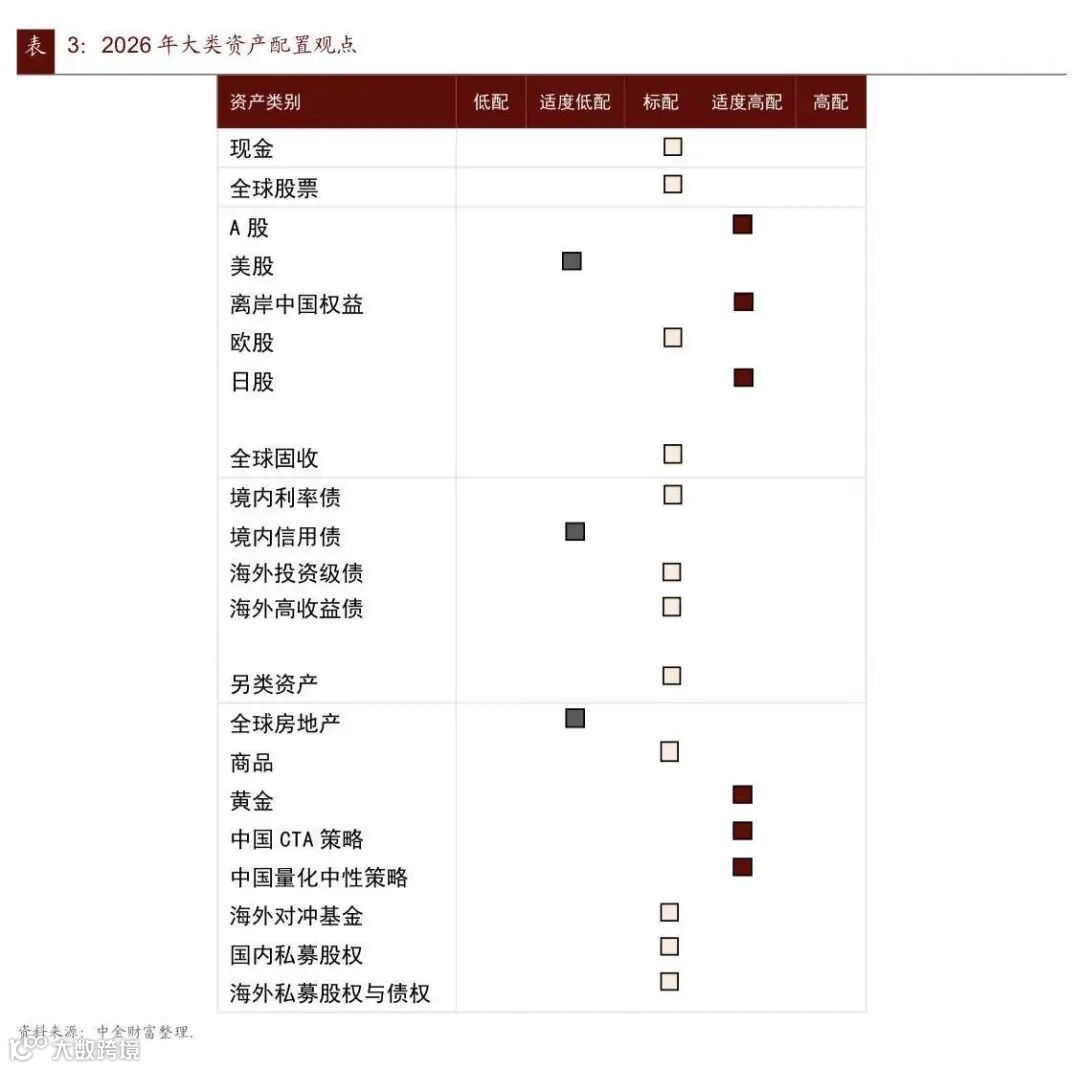 和往年一样,我们对各主要资产类别也有一些战术层面的观点。投资者在构建好战略资产配置组合的基础上,可以适当参考以下战术观点,以适应2026年可能发生的一些新趋势: