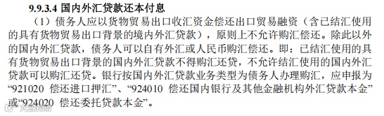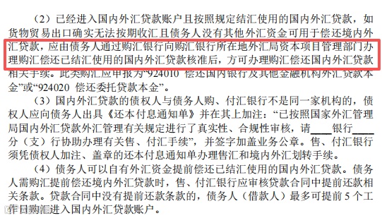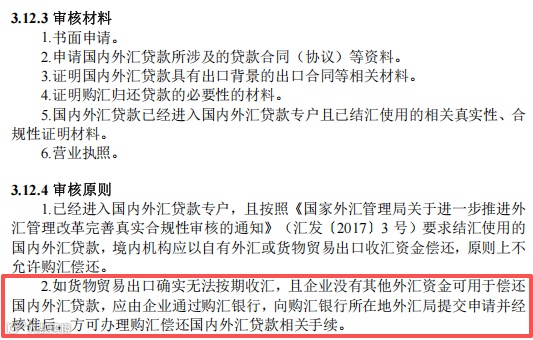 (四)放宽具有出口背景的国内外汇贷款购汇偿还。出口押汇等国内外汇贷款按规定进入经常项目外汇结算账户并办理结汇的,企业原则上应以自有外汇或货物贸易出口收汇资金偿还。在企业出口确实无法按期收汇且没有其他外汇资金可用于偿还上述国内外汇贷款时,贷款银行可按照审慎展业原则,为企业办理购汇偿还手续,并于每月初5个工作日内向所在地外汇局报备有关情况。