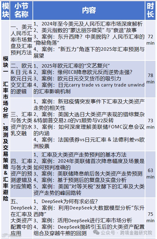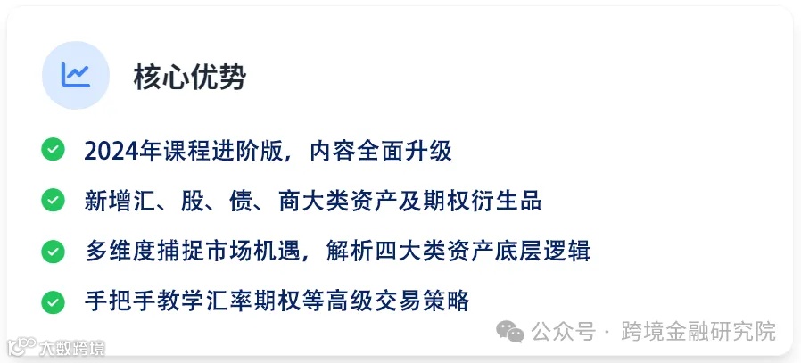 2024年,跨境金融研究院推出《一门课学懂外汇交易与汇率市场》课程,收获一众好评;2025年,在此基础上,我们进一步推出《2025全球汇率与衍生品实战:进阶版 · 大类资产联动+期权交易全解析》课程,帮助大家形成一套行之有效的汇率市场及大类资产分析方法,更好地优化资产配置,从而做出更明智的投资决策。