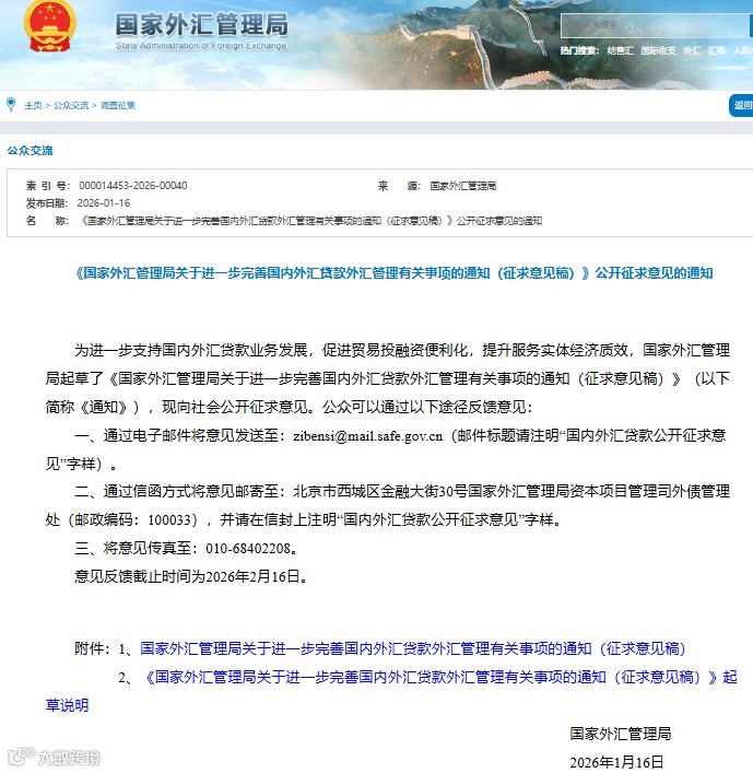 2026年1月16日,外汇局发布《国家外汇管理局关于进一步完善国内外汇贷款外汇管理有关事项的通知(征求意见稿)》,明确跨境人民币结算无需适用国内外汇贷款要求;允许服务贸易出口的国内外汇贷款结汇;取消国内外汇贷款结汇后如需购汇需要外汇局核准的要求;允许资本项目结算账户资金质押发放人民币贷款等。