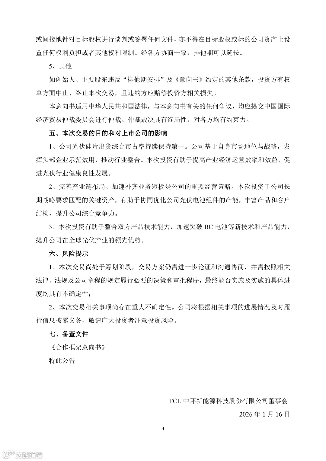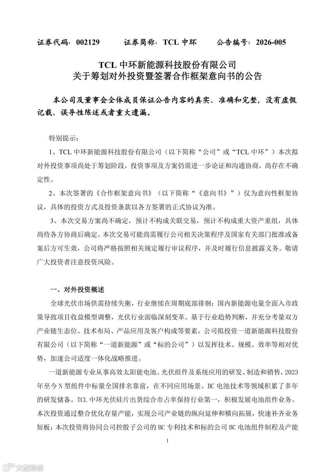 TCL中环与一道新能源已经签署《合作框架意向书》,拟通过受让股份、接受表决权委托、增资等方式,对一道新能源进行投资,本次交易中,主要股东拟转让其持有的全部或部分标的公司股份,具体转让价格和交易方式等由相关方后续签署协议另行约定。自意向书签署后 90 日内投资方拥有本意向书涉及的相同或类似交易的独家谈判权。