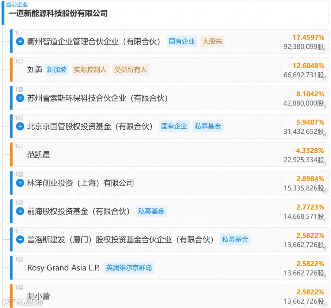 企查查显示,一道新能源前十股东如下图所示