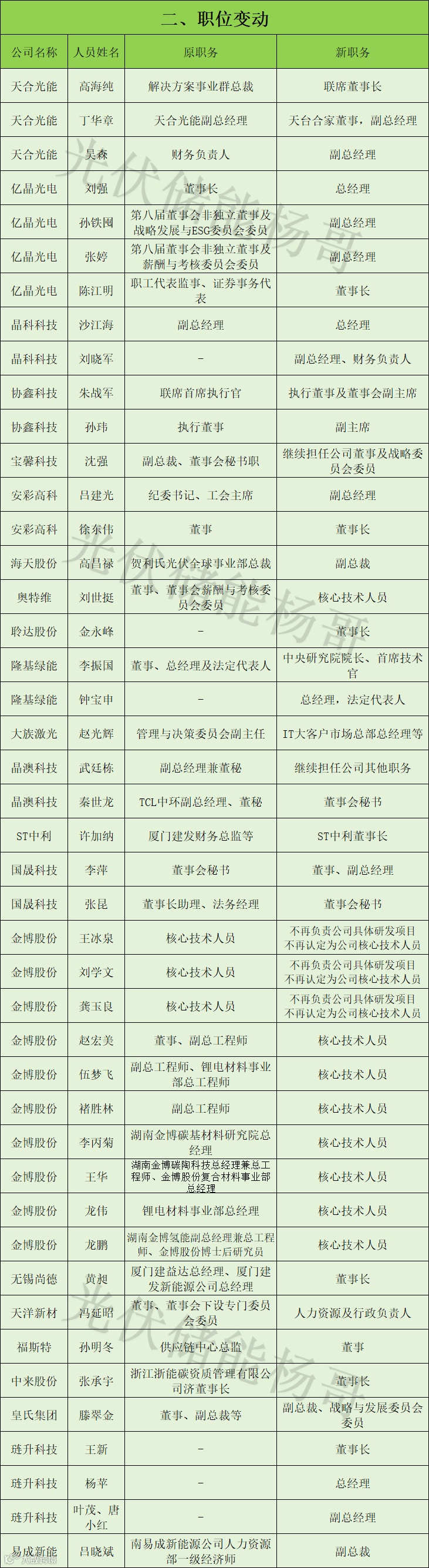 隆基绿能:创始人李振国辞任总经理,回归技术研发,“90 后”女儿进入董事会;亿晶光电:选举“90 后”陈江明任董事长,成为行业最年轻掌舵人;润阳股份:“光伏老兵”唐骏卸任总裁,新旧交替浪潮清晰。