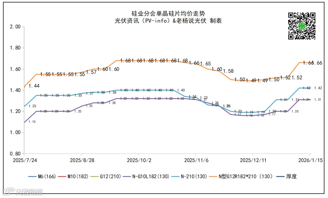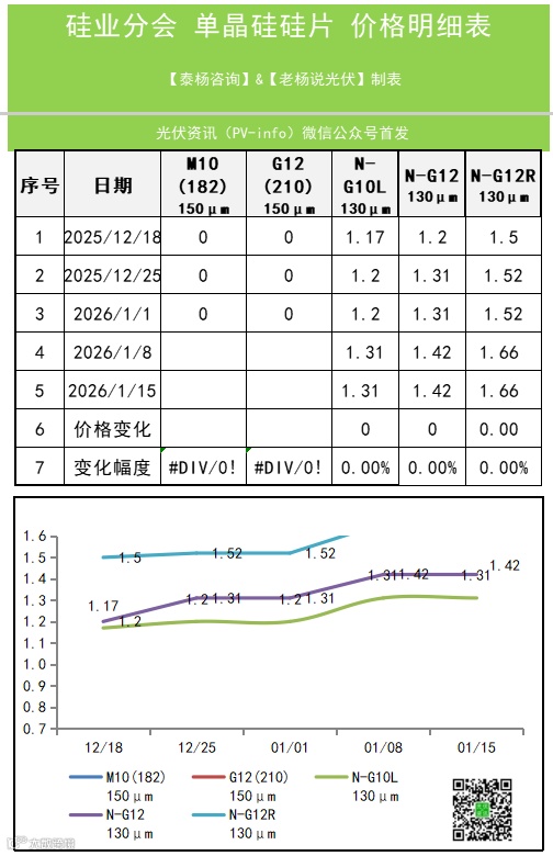 本周硅片价格整体持稳。其中,N型G10L单晶硅片(182*183.75mm/130μm)成交均价在1.31元/片,环比上周持平;N型G12R单晶硅片(182*210mm/130μm)成交均价在1.42元/片,环比上周持平;N型G12单晶硅片(210*210 mm/130μm)成交均价在1.66元/片,环比上周持平。