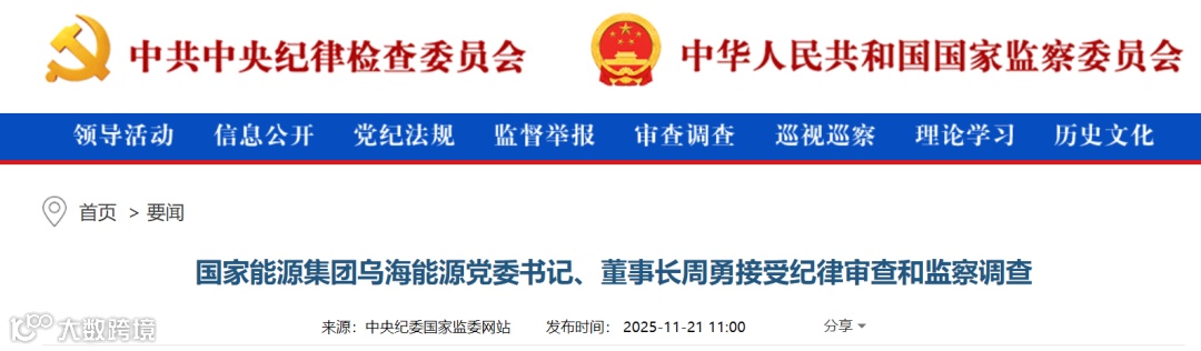 近日【光伏资讯】微信公众号(PV-info)了解到,中央纪委国家监委网站11月21日消息,据中央纪委国家监委驻国家能源集团纪检监察组、青海省纪委监委消息:国家能源集团乌海能源党委书记、董事长周勇涉嫌严重违纪违法,目前正接受中央纪委国家监委驻国家能源集团纪检监察组纪律审查和青海省海南藏族自治州监察委员会监察调查。