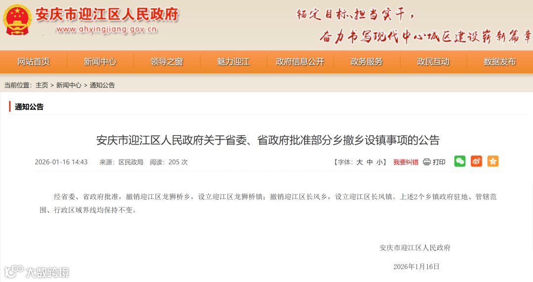 1月16日,安庆市迎江区人民政府发布关于省委、省政府批准部分乡撤乡设镇事项的公告。