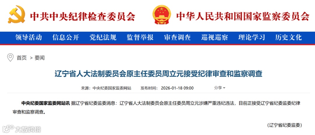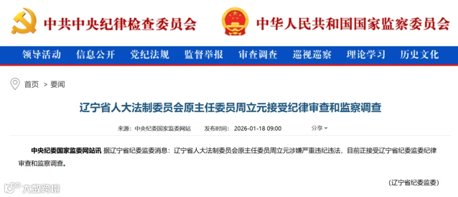 据辽宁省纪委监委消息:辽宁省人大法制委员会原主任委员周立元涉嫌严重违纪违法,目前正接受辽宁省纪委监委纪律审查和监察调查。