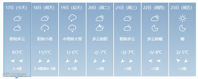 19日(周一):中雪转大雪,气温骤降至1℃/-6℃,4-5级北风呼啸,体感温度更低