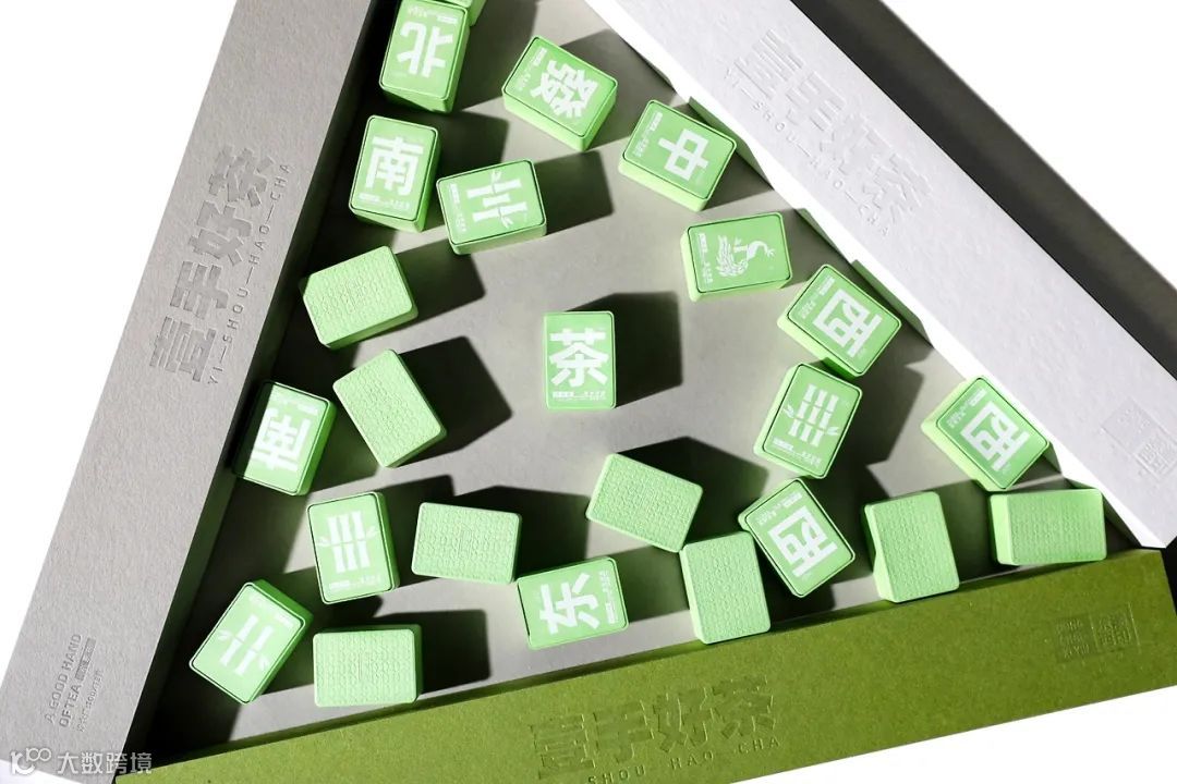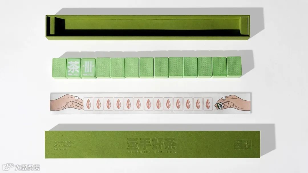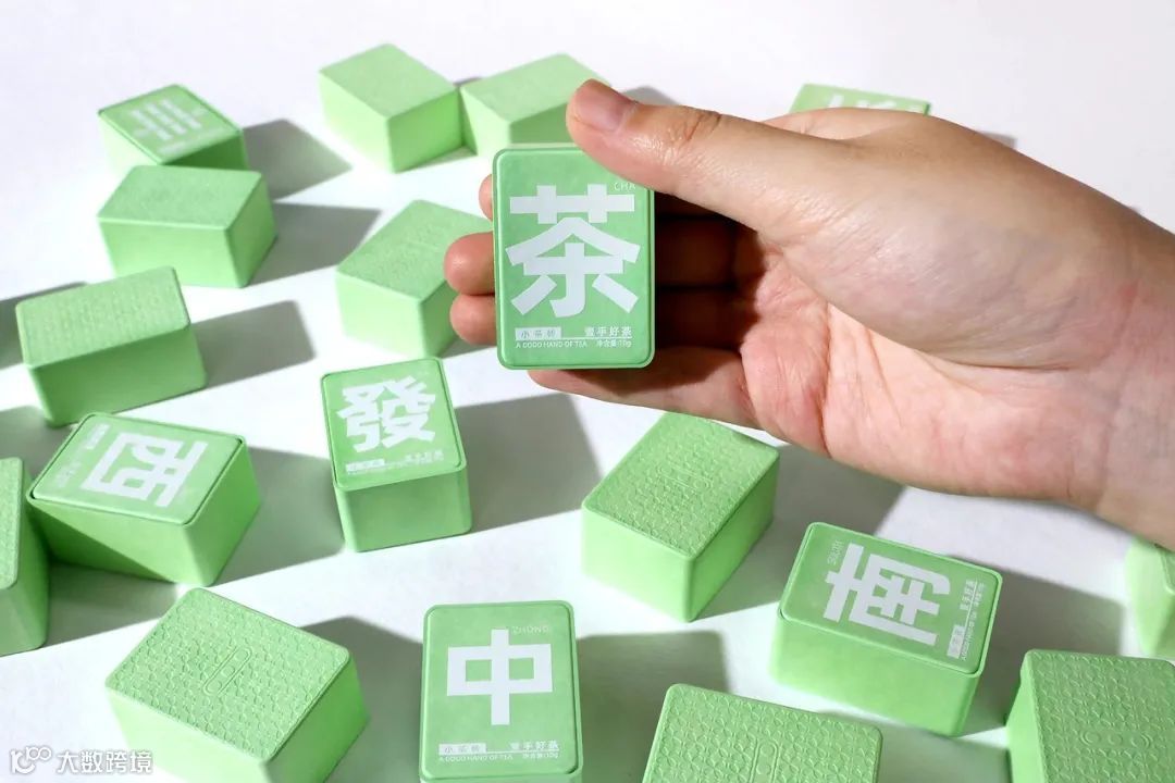 【壹手好茶】以广东麻将文化为灵感,将传统娱乐形式融入产品设计中。礼盒参考麻将排列方式,采用低饱和度色彩传递简约风格,迷你麻将大小的茶砖上印有麻将图案如“西”“中”“发”,提供沉浸式体验。这种设计不仅趣味十足,更传递积极人生态度,让品茶成为一种文化享受。