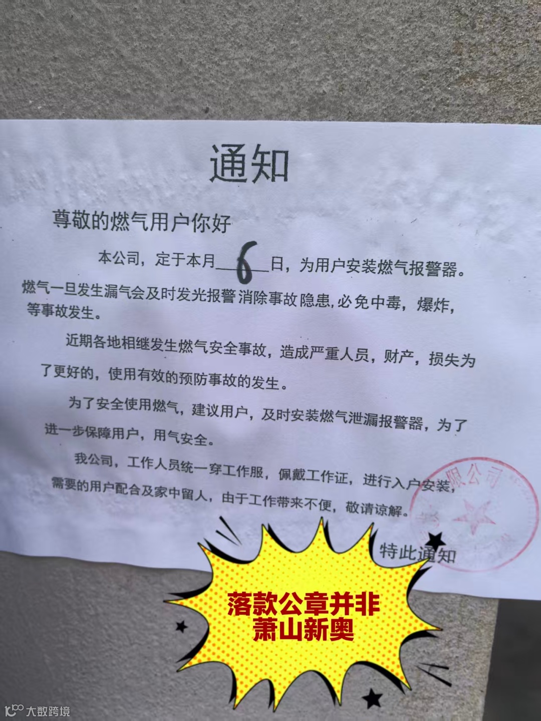 近日,我公司一线多能工师傅在某小区内发现,有非官方燃气设备公司张贴“上门安装燃气报警器”通告,落款、样式易让用户误认为是萧山新奥发布。
