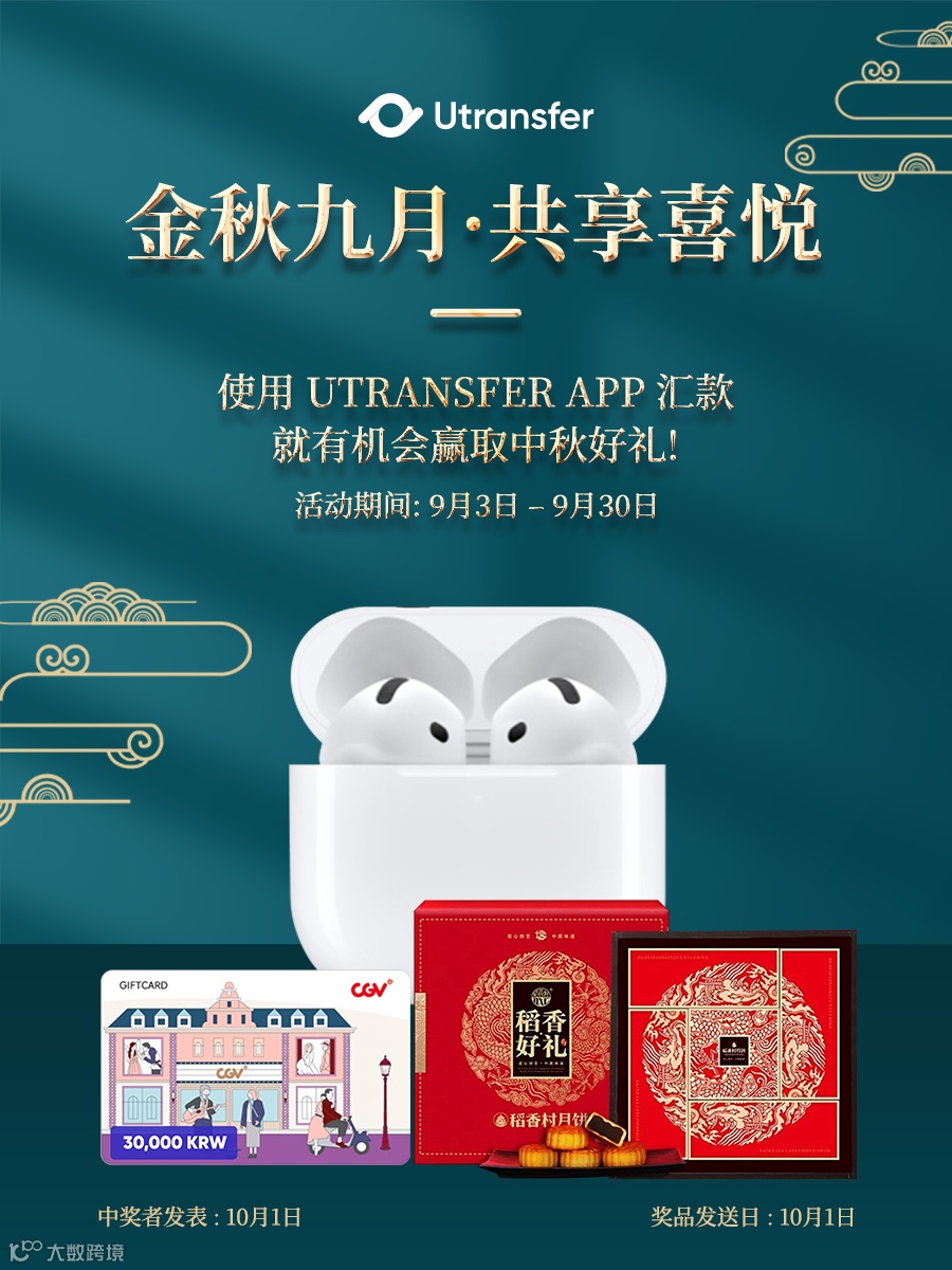 Utransfer推出九月幸运客户抽奖活动,凡在活动期间通过Utransfer完成汇款的用户,即有机会获得Apple AirPods、CGV 3万韩币电影券、中秋礼盒等多重好礼。平台致力于提供安全、快捷的跨境汇款服务,助力用户高效完成资金 transfer。