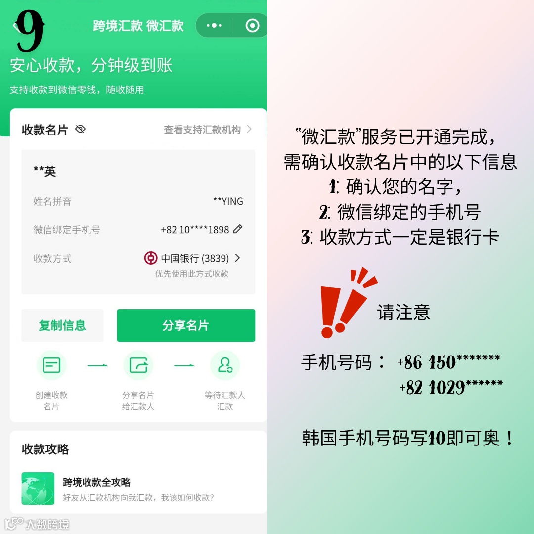 - 微信账户须绑定中国境内银行卡,方可接收境外汇款。