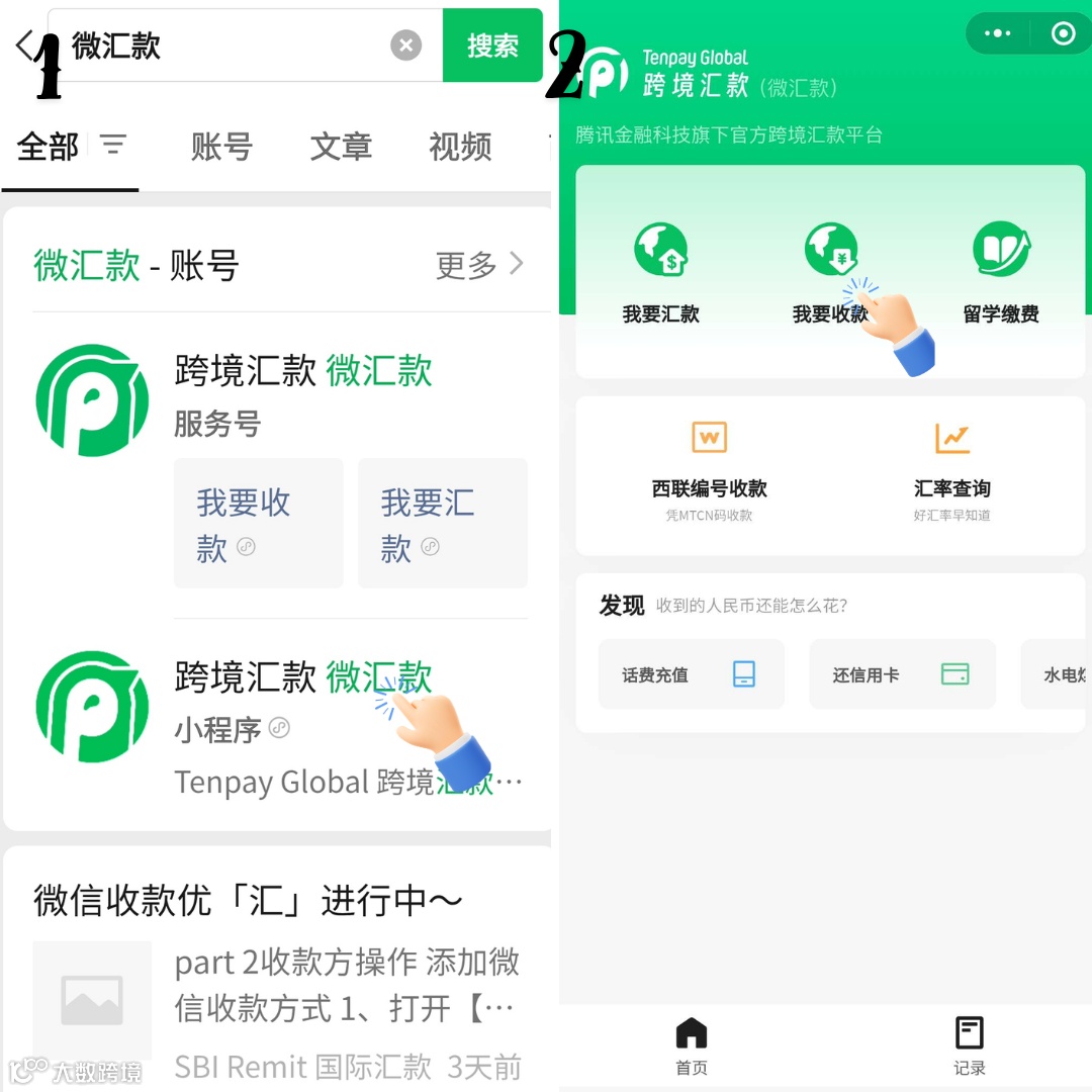 - 在微信中搜索“微汇款”小程序,进入主页面。