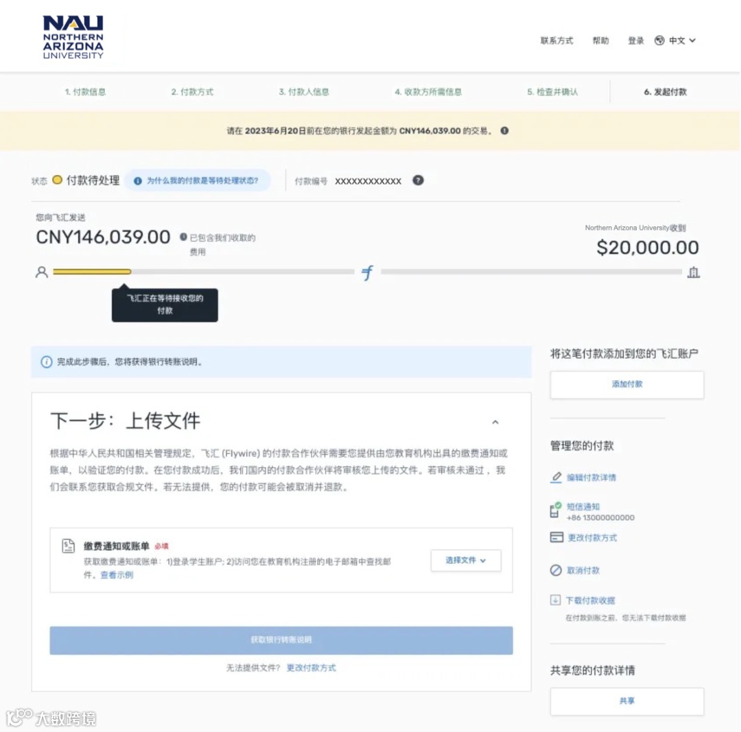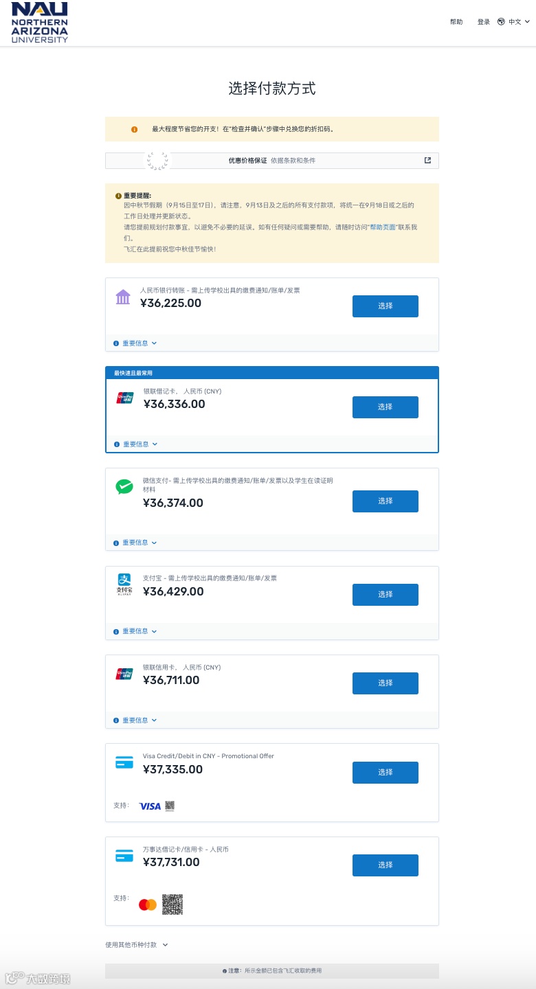 为解决中国留学生海外缴费难题,北亚利桑那大学(Northern Arizona University)与全球领先的跨境支付平台飞汇(Flywire)达成合作,提供更安全、便捷、符合中国用户习惯的学费缴纳方式。