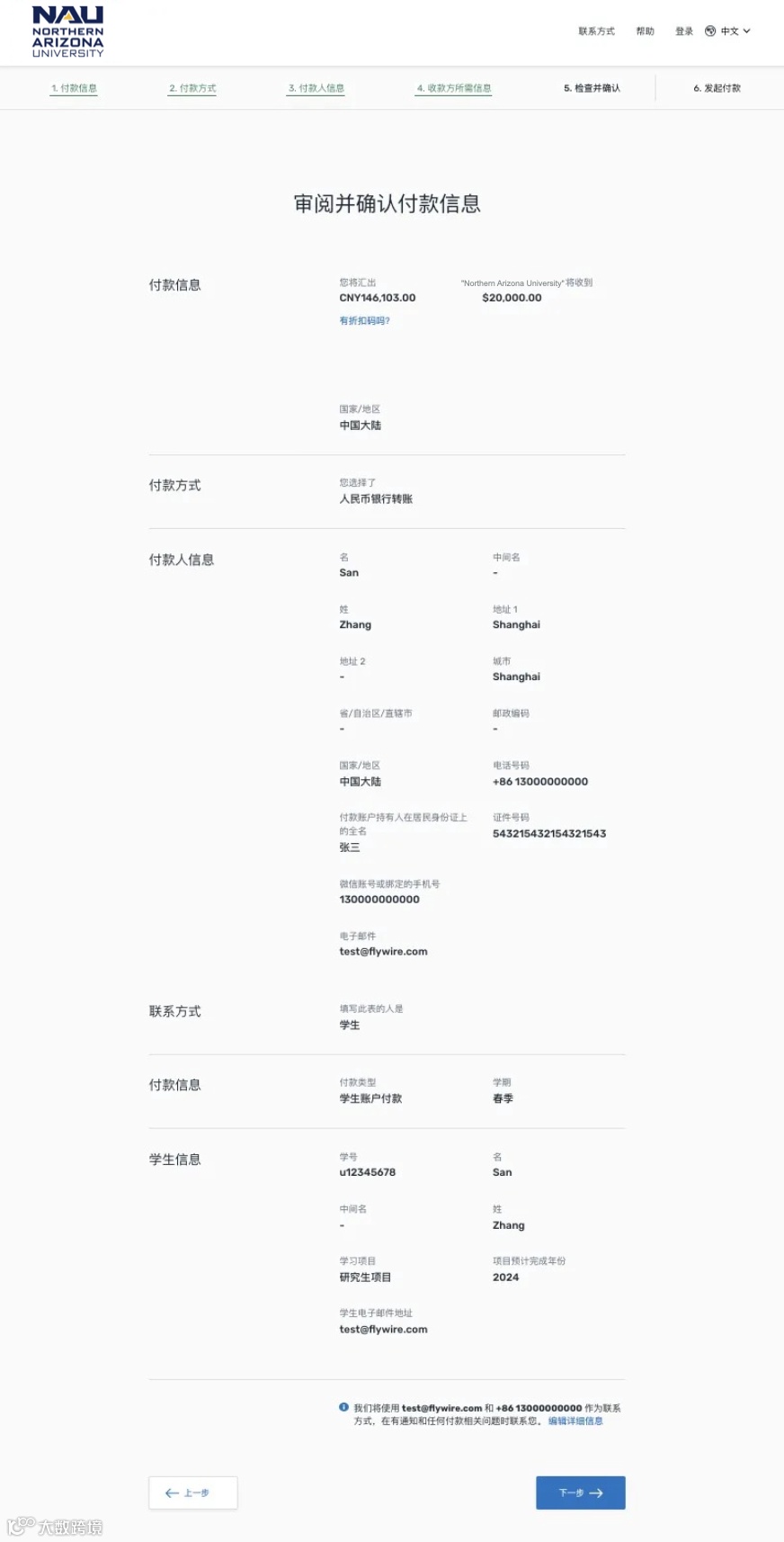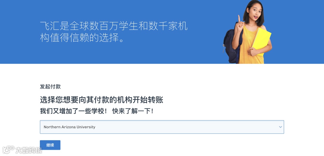 访问 pay.flywire.com/zh,搜索 Northern Arizona University 并点击继续。