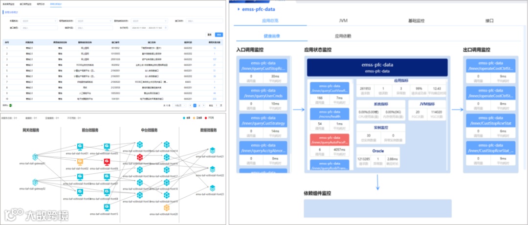一是监控集成系统调用情况,直观展示系统、接口、日志三个层面指标信息,分析集成接口运行情况,及时定位异常;二是追踪从网关微服务、前台微服务、中台微服务到数据微服务的全过程调用链路,同时直观展示单个微服务健康画像、应用上下游及其相关模块或组件的运行总览信息。下图2为微服务调用全链路及针对单个微服务的健康画像监控页面。