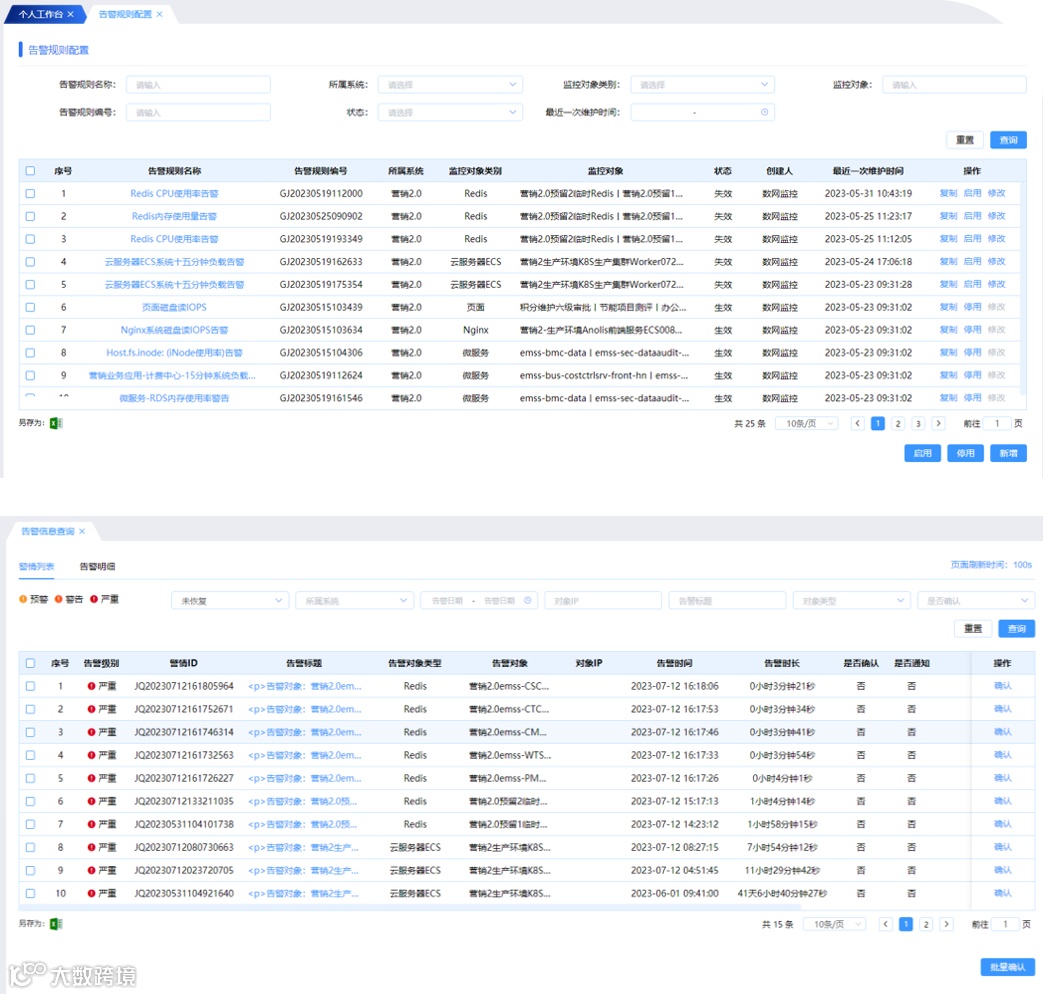 告警管理支持自主配置告警策略,构建告警统一出口、信息统一推送、事件统一展示、工单统一管理的告警体系能力。下图4为告警管理核心页面。该模块提升了告警策略及规则配置的自主性、便捷性,实现告警事件的统一汇总展示及全生命周期跟踪。