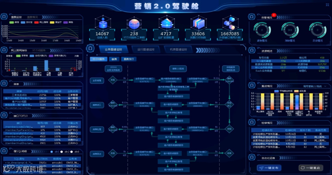 该产品已于2024年10月起陆续在江西、湖南等地上线运行。以江西为例,该产品依托营销2.0驾驶舱实现对营销2.0、网上国网、关键接口调用、关键业务、五标七率同步等40项核心内容的精细化分析与动态监测,全方位支撑江西营销2.0平稳运行与高效运营运维。