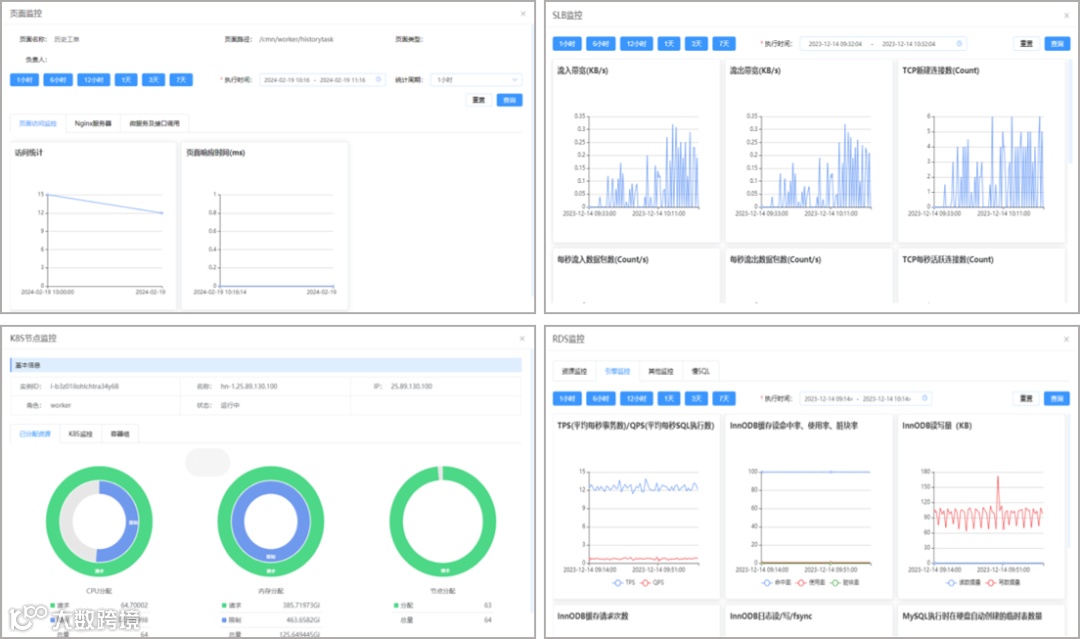 全景监控实现总览营销2.0系统全局,聚焦前端、云平台、数据库等系统各监控层级,借助日志解析、链路追踪、云平台组件接口调用等手段,协助运维人员全面观测系统运行全景,把控各层级监控对象核心运行指标。下图1为前端页面、SLB等部分关键组件的监控页面呈现形式。