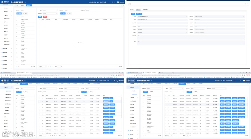 发布管理功能聚焦数字化系统部署发版上线全链路,围绕检修计划提报、流程审批、版本发布、版本回滚、检修报告生成等关键环节,转由依托程序最大化控制相关操作,保障“一次维护、多组复用、拉齐批次、稳定发布”,下图2为发布管理相关页面。该模块增强了各业务组与运维组间协同联动性,压降人力及时间成本消耗,提升版本发布质效。