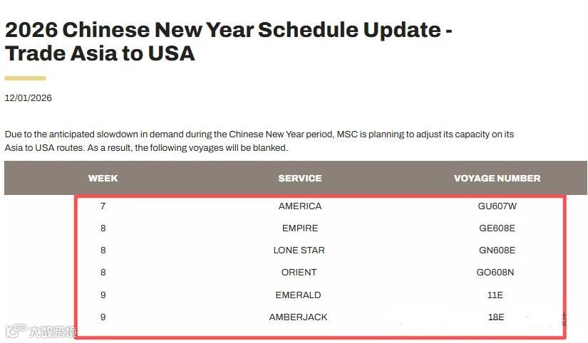2026春节临近,亚洲至欧美货运需求可能会下滑,因此地中海、马士基、赫伯罗特等船司近期陆续发布运力调整通知,计划在春节期间对多条航线实施临时停航,以匹配货量变化。具体停航情况如下: