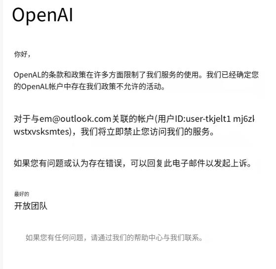 - 提交申诉:使用注册时绑定的邮箱,通过OpenAI的官方支持渠道提交申诉。确保申诉内容简洁明确地描述了封号前的使用情况,不带情绪化或对抗性语言。