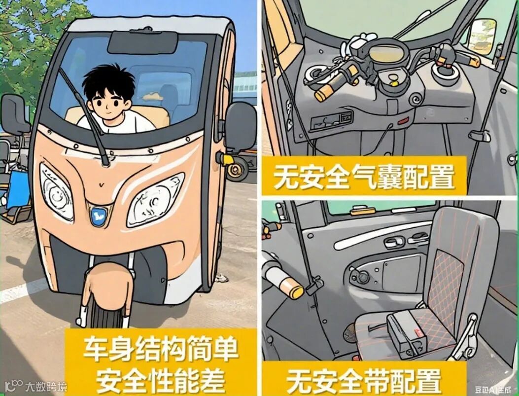 电动三、四轮车多为低速电动车,生产标准不统一。车身窄、底盘低、重心高,导致车辆缺乏必要的稳定性。车辆没有防撞钢梁配置、安全带和安全气囊配置,车辆转向、制动等安全部件性能也普遍较差。一旦遇到紧急情况,很容易倾斜、翻车,导致出现车毁人亡的恶性事故。