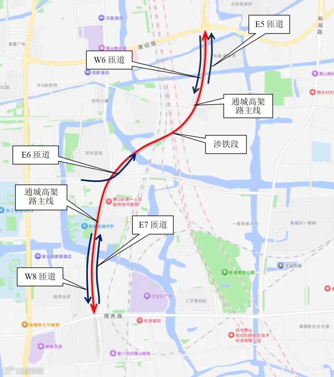 E5、W6分别为通城高架萧绍路南侧一对平行上下匝道;E6为通城高架南向北上匝道,位于拱秀路上;E7、W8为通城高架南秀路北侧一对平行上下匝道。配合高架段开通,拱秀路(商城南路-滨水路)和商城南路地面道路(拱秀路-新螺路)段进行临时保通。