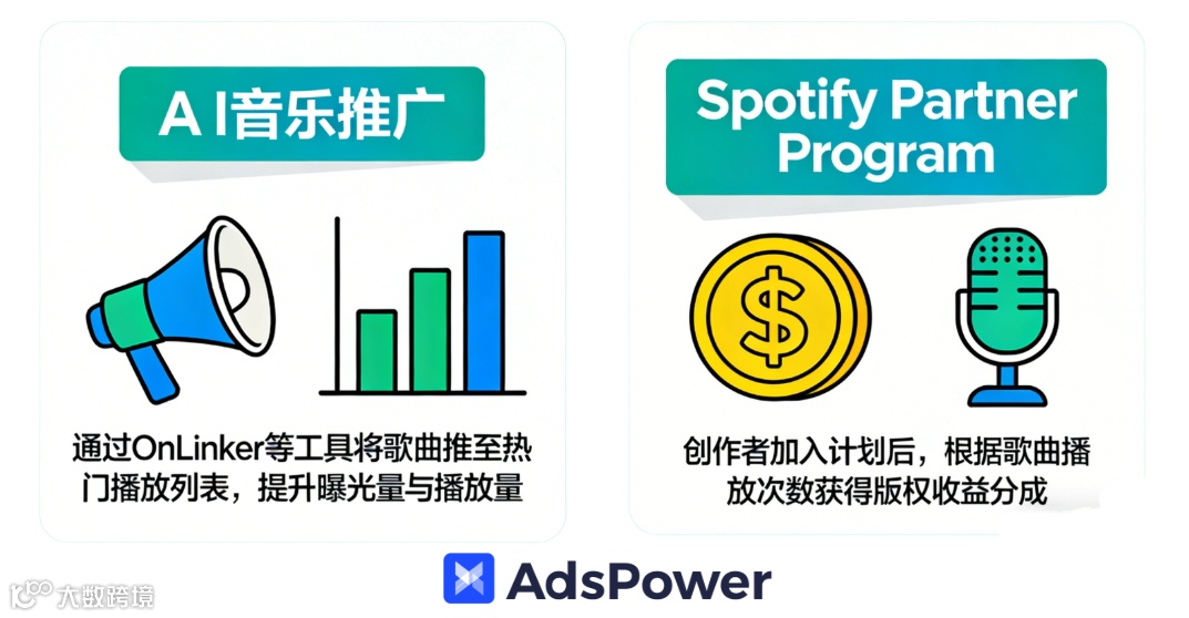 今天本文就将拆解 Spotify 的两大核心变现路径 ——AI 音乐推广、Spotify Partner Program 的收益规则与申请方法,同时分享 AdsPower 工具的高效运营技巧,帮创作者在 Spotify 平台实现更稳定的收益增长。