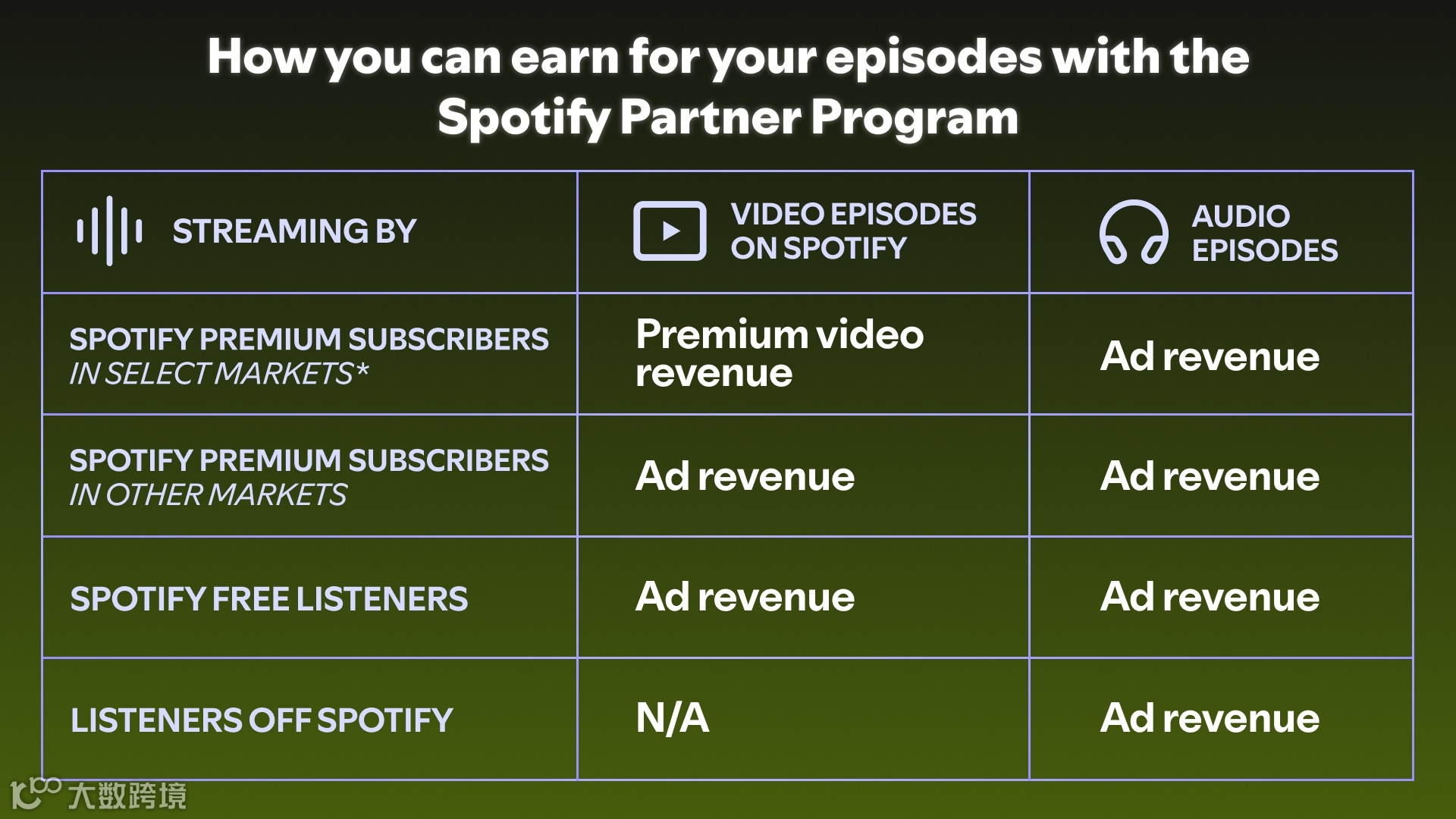 分成规则:节目播放 Spotify 投放的广告(平台内外),可获 50% 收入分成