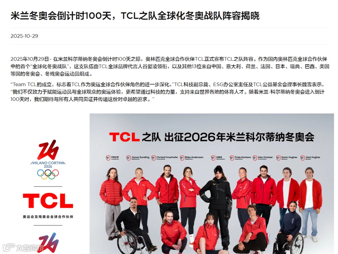TCL作为奥林匹克全球合作伙伴,打造“Team TCL 全球化冬奥战队”,集结多国冬奥及冬残奥运动员,通过社交媒体互动提前激活话题,强化全球品牌形象。