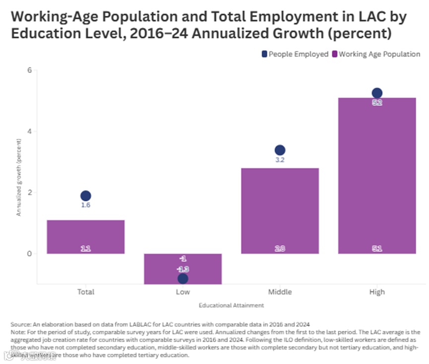 - 过去十年,拉美劳动力教育水平显著提升,中高技能岗位增长快于其人口增速,而低教育水平群体失业率上升,显示劳动力结构持续优化但分化加剧。