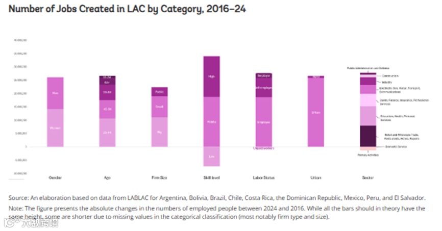 - 2016至2024年,拉美新增约2700万个就业岗位。其中,零售与酒店业新增790万,教育、医疗及个人服务业新增730万,合计占总数一半以上。大型企业贡献1110万个岗位,小型企业790万个;受薪岗位增幅为自雇岗位的两倍以上。同时,新增雇主160万人,无偿工作减少90万。
