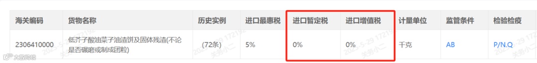 菜籽粕通常归入税则号列2306410000,关税和增值税均为0%,监管条件为AP,需申报入境检验检疫及进境动植物检疫。