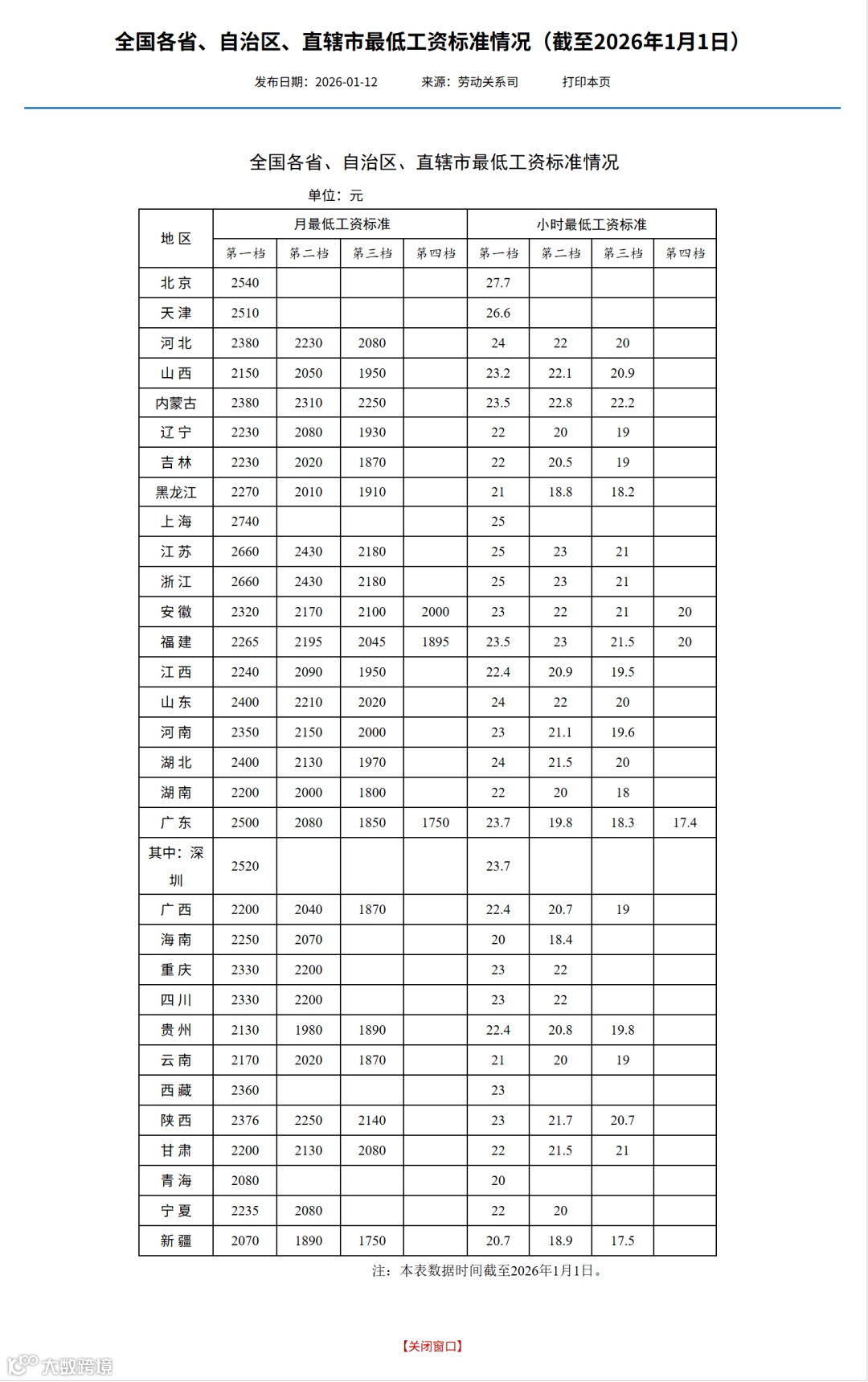 2026年1月12日,人力资源和社会保障部劳动关系司正式发布全国各省、自治区、直辖市最低工资标准(截至 2026年1月1日)。此次标准分为月最低工资标准(monthly minimum wage standard)和小时最低工资标准(hourly minimum wage standard)两类,各地根据经济发展水平设置 1-4 档梯度,既适配区域发展差异,也为劳动者权益保障提供明确依据。