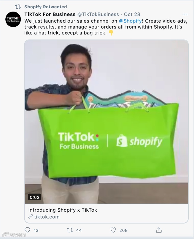 此举合作能让全球100多万Shopify商家在TikTok上创建商业账号来展示产品、自动生成视频广告,TikTok用户点击视频后即可前往Shopify商店进行购买。