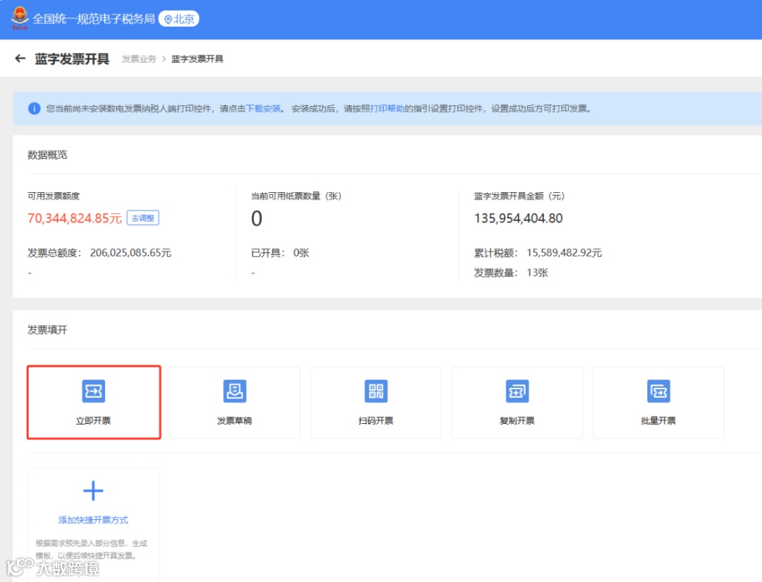 系统提示“开票成功”后,可选择发票交付方式、下载电子文件或直接打印纸质发票。