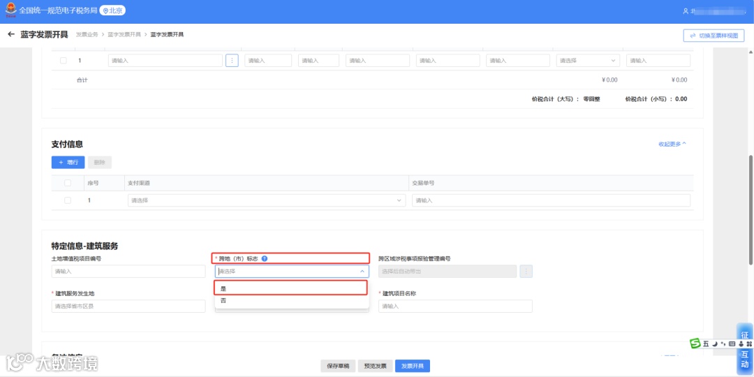在【开票信息】栏填写项目名称、金额等内容。进入【特定信息-建筑服务】栏目,根据实际情况选择【跨地(市)标志】为“是”或“否”。