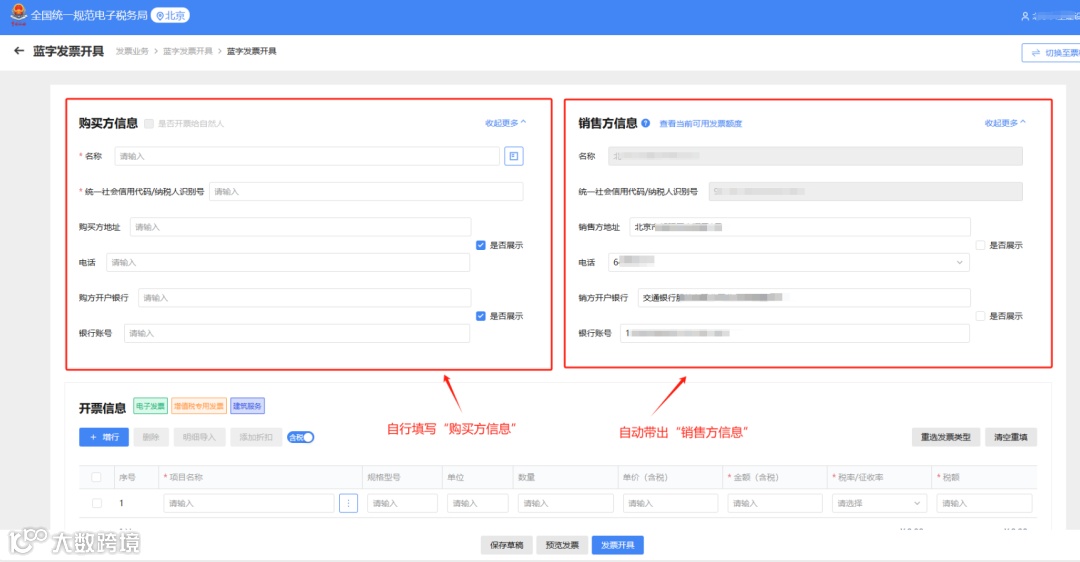 销售方信息由系统自动带出;购买方需手动填写名称、统一社会信用代码或纳税人识别号等基本信息。