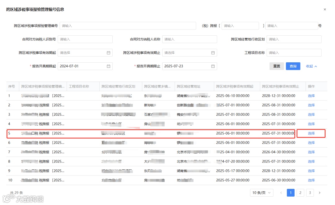 从弹出列表中选择对应的“跨区域涉税事项报验管理编号”,点击【选择】完成关联。