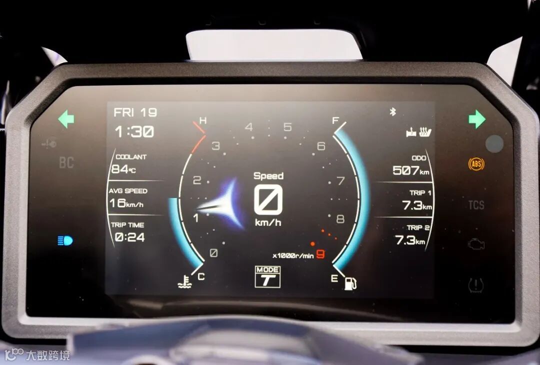 ▲7寸大型TFT显示器,将速度与引擎转速配置在中央位置,周围显示单次里程、总里程、水温等信息。