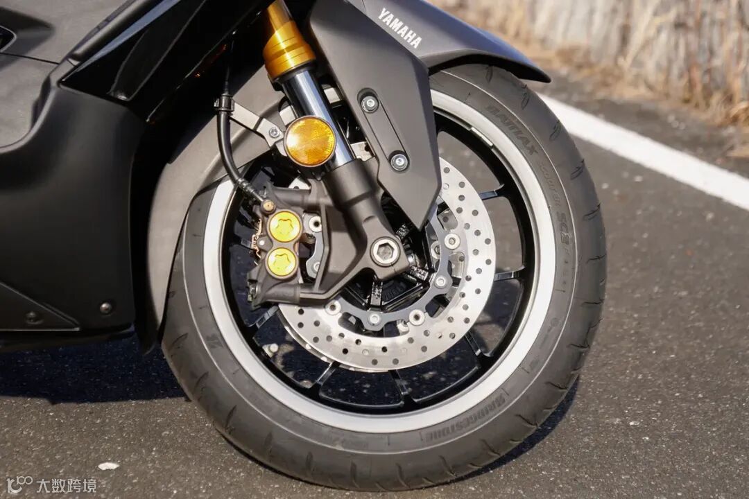 ▲除了油压刹车,还配备钢索式手刹车。轮胎采用Bridgestone制BATTLAX SCOOTER SC2。