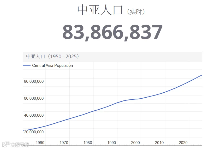 Worldometers数据显示,截止到2025年,中亚五国总人口达8386万,较2000年净增2700万;且经济保持稳定增长,2024年区域生产总值达5133亿美元,预计2029年将突破7739.7亿美元。