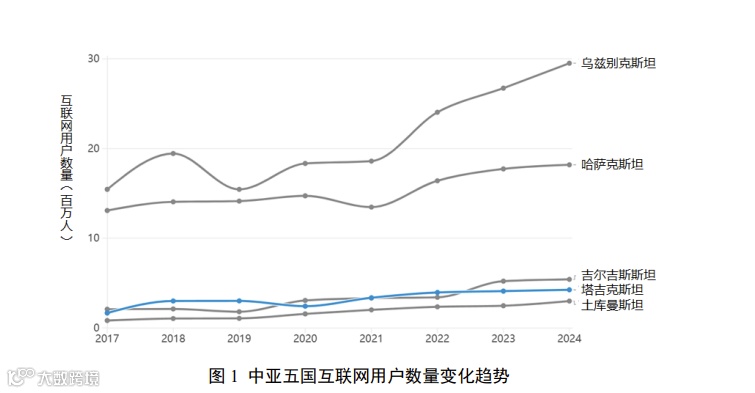 具体来看,2017-2024年间,中亚五国的互联网用户数量持续上升。其中,乌兹别克斯坦增长较为明显,2024年互联网用户达2952万人;