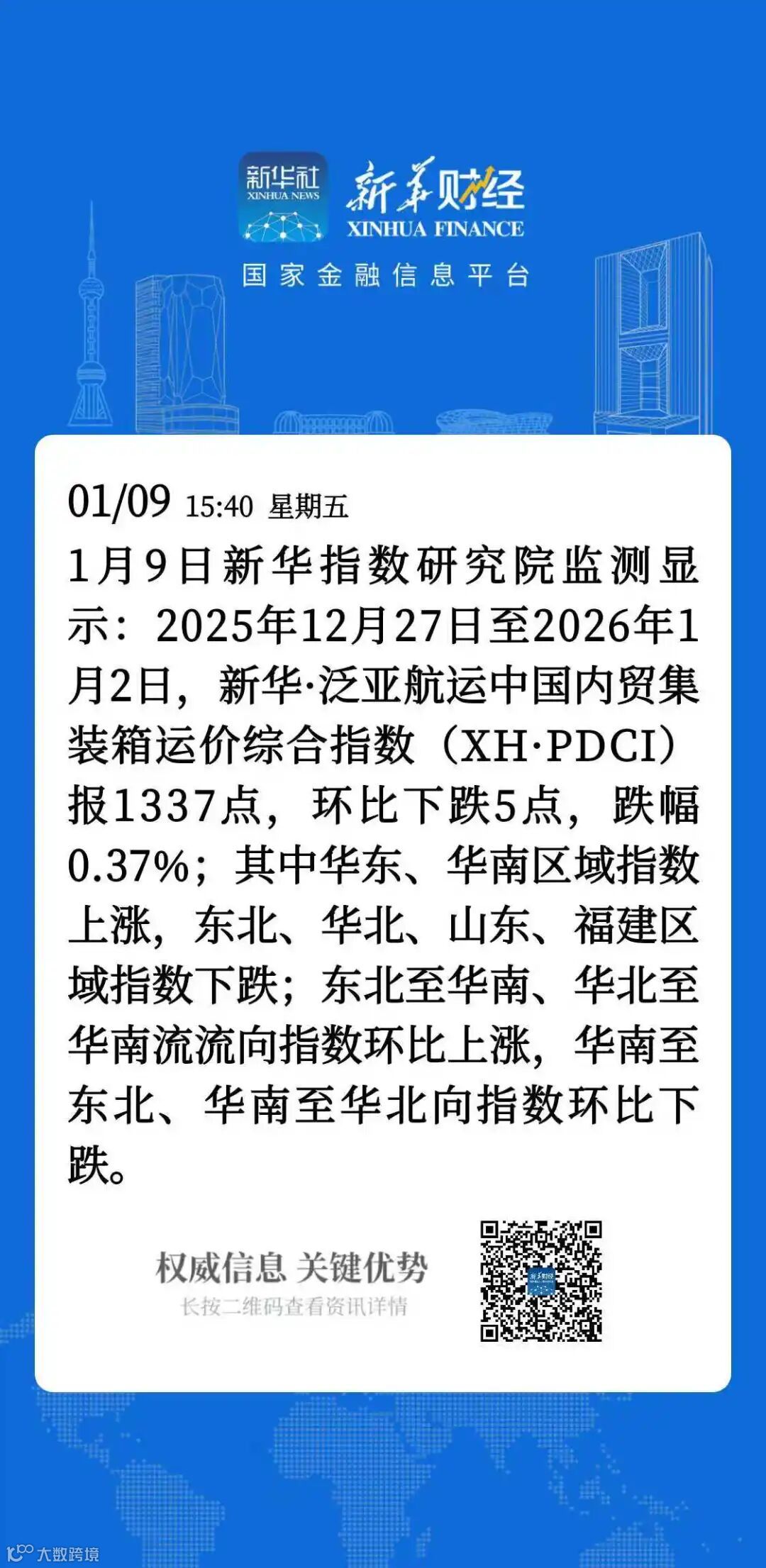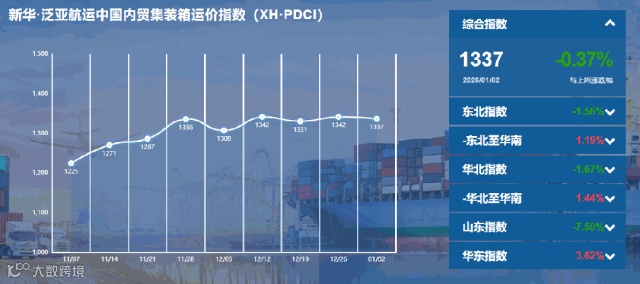 核心提示:本期(2025年12月27日至2026年1月2日)新华·泛亚航运中国内贸集装箱运价指数(XH·PDCI)报1337点,较上期(2025年12月20日至12月26日)下跌5点,跌幅0.37%;同比下跌14点,跌幅1.04%;6只区域子指数两涨四跌,4只流向指数两涨两跌。
