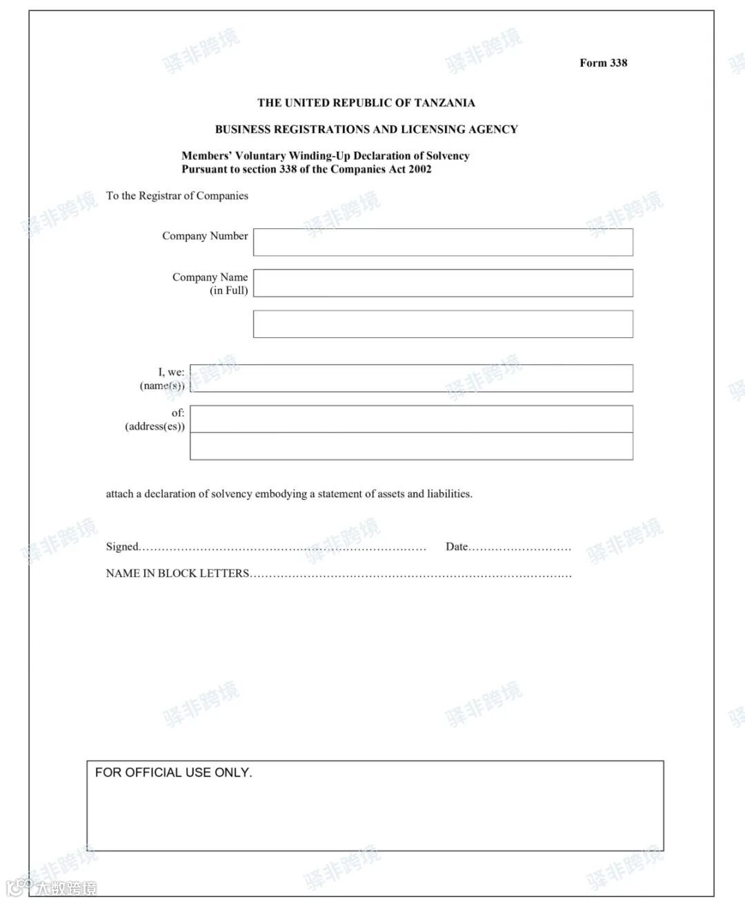 向BRELA提交偿付能力声明(表格338),董事会必须在股东通过公司清盘决议前30天内完成此操作。表格参考如下: