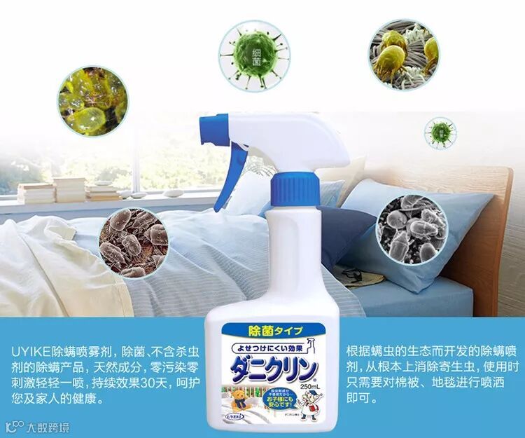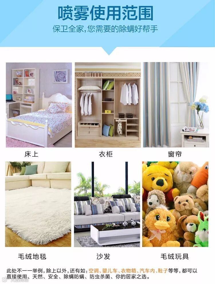 使用除螨剂只需对棉被、地毯进行喷洒即可发挥对螨虫的驱除作用,抑制效果长效持续。