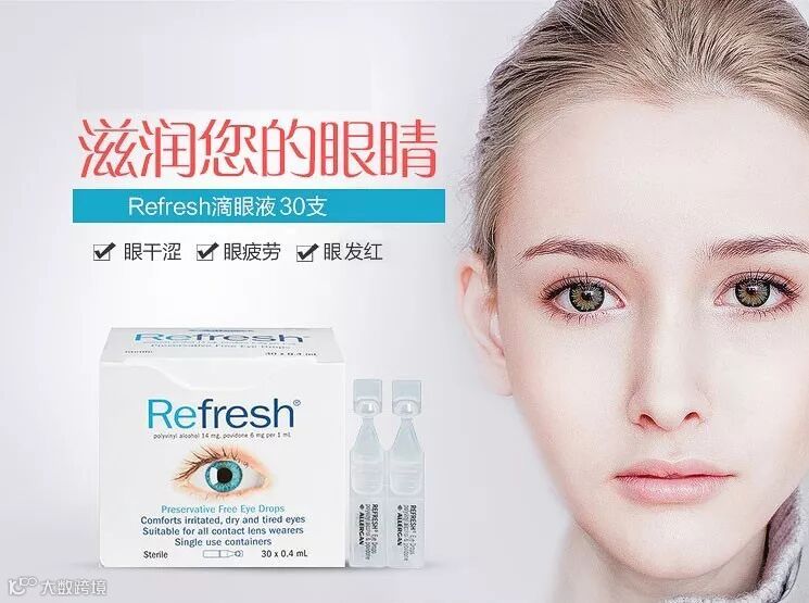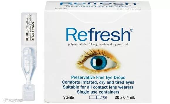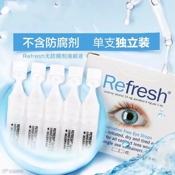 Refresh的眼药水,无防腐剂,缓解眼疲劳和干涩,单独包装,一盒有三十支。